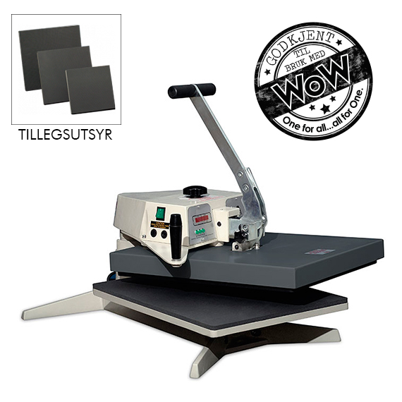 En høy kvalitets varmepresse med støpt aluminiumsramme produsert i England. Varmepressen har en sving bar topp plate som gir deg god sikt og enkel tilgang til det du skal trykke på. Utstyrt med avansert datastyrt LED-kontroller for nøyaktig innstilling av både tid og temperatur. Trykkjustering er lett tilgjengelig oppe på varmepressen.