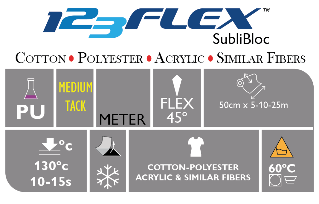 Med SubliBloc tekstilfolie forhindres fargene på tekstil fra å blø gjennom ved varmebehandling. Tekstilfolien har ellers de samme egenskapene som 123Flex.