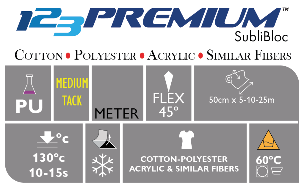 Med SubliBloc tekstilfolie forhindres fargene på tekstil fra å blø gjennom ved varmebehandling. Tekstilfolien har ellers de samme egenskapene som 123Flex.