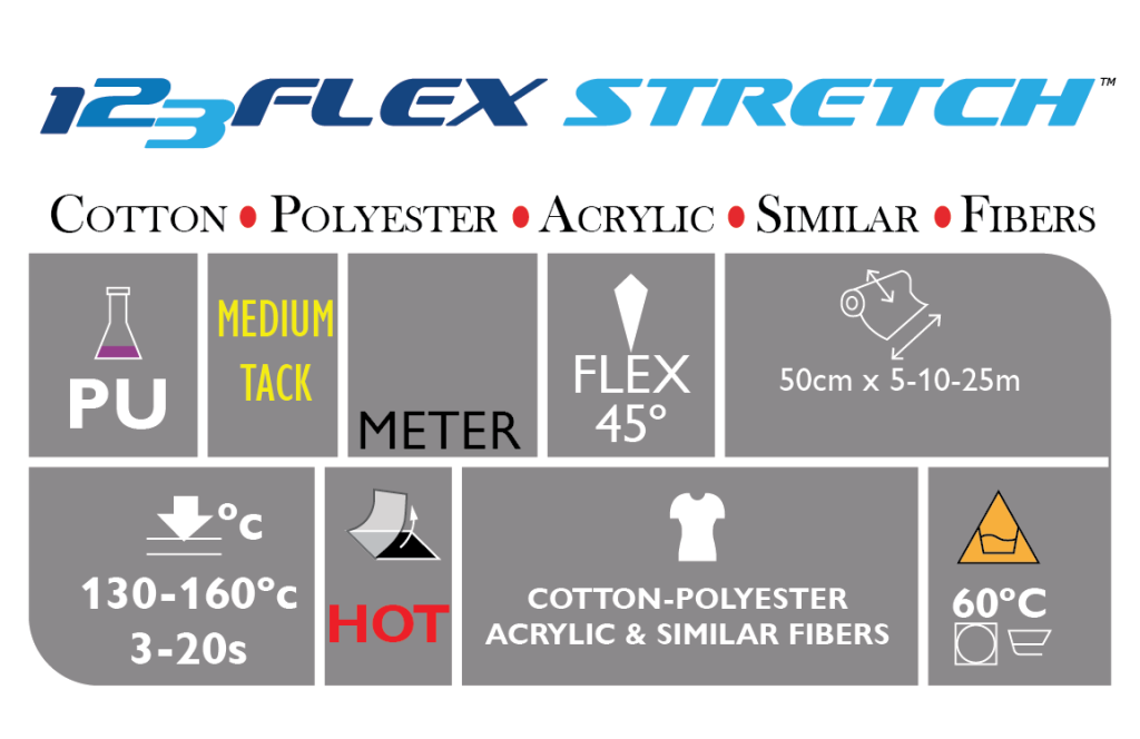 123Flex Stretch er en førsteklasses tynn, elastisk tekstilfolie. Vi anbefaler stretch folien til bruk ved større motiver som trenger å strekkes ved bruk. 123Flex Stretch folien er utfordrende å plukke ved små detaljer pga. elastisiteten. 123Flex Stretch tekstilfolie har medium heft til følgefilmen. Alle våre tekstilfolier er av høy kvalitet og garanterer heft på alle typer tekstiler (unntatt nylon og tekstiler belagt med hydrofobisk coating). Følg bruksanvisning i produksjon.