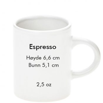 Endelig har vi fått inn hyggelige små espresso kopper. Perfekt til de fleste espressomaskinene. Dekorer koppen med ønsket motiv og logo. Koppen kan også være egnet som shots-glass. Artig innslag i arrangementssammenhenger. Disse koppene kan være hyggelige innslag til påske, jul og sommer. Koppene rommer 1 dl drikke. Perfekt liten artikkel i suvenirbutikken.