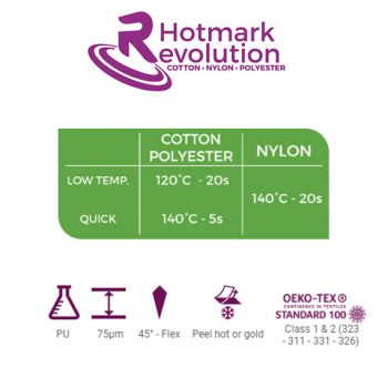 Vi leverer Hotmark sin fleksible transferfolie. Denne folien påfører dere like effektivt som våre FLEX123 folier med kun 5/7sekunder i varmepresse. Hotmark Revolution garanterer heft på bomull, polyester men også på nylon. Folien er fin og jobbe med, enkel og plukke og gir et behagelig resultat på trykket. Trykket tåler selvsagt vask (se vaskeanvisning) og tørketrommel. Denne folien anbefaler vi der underlaget er glattere materialet.