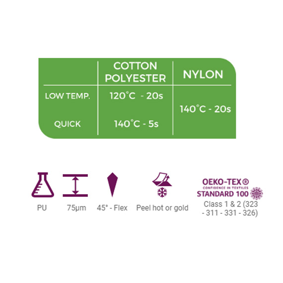 Vi leverer Hotmark sin fleksible transferfolie. Denne folien påfører dere like effektivt som våre FLEX123 folier med kun 5/7sekunder i varmepresse. Hotmark Revolution garanterer heft på bomull, polyester men også på nylon. Folien er fin og jobbe med, enkel og plukke og gir et behagelig resultat på trykket. Trykket tåler selvsagt vask (se vaskeanvisning) og tørketrommel. Denne folien anbefaler vi der underlaget er glattere materialet.