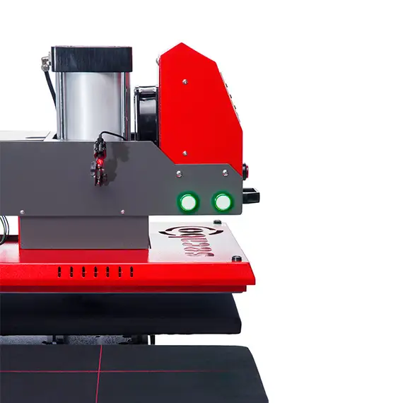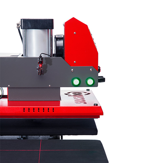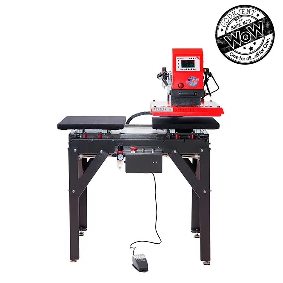 Nyheten TMT Premium x2 er en ergonomisk varmepresse med høyt kontakttrykk, suveren varmeeffekt og varmefordeling på en 40 x 50cm plate. Varmepressen har digital Timer og LED display med automatisk tid og temperaturstyring samt programmering med bl.a. mulighet til forvarming/press til ønsket tid. Det er også mulig å skifte underplatene med «Quick Change» system (tilleggsutstyr). Varmepressen er utstyrt med krysslaser for enklere/nøyaktig plassering av trykk. Elementet sikrer presis varmefordeling og åpner seg automatisk ved endt syklus og veksler side ved hjelp av fotpedal.