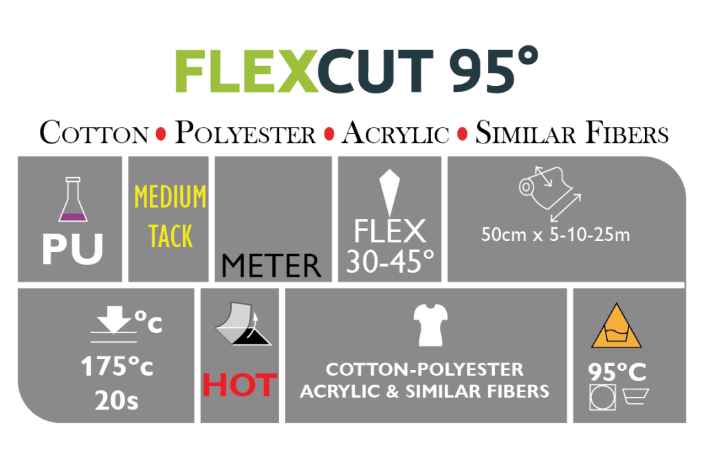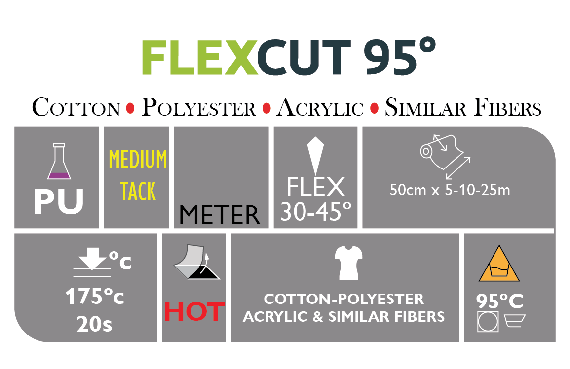 Velg vår unike tekstilfolie der mye vask av tekstilen er vesentlig. Flexcut 95° er en brukervennlig og effektiv folie å jobbe med. Flexcut 95° er en tekstilfolie som kan vaskes på inntil 95 grader. Vi garanterer heft på alle typer tekstiler med unntak av nylon og behandlede tekstiler. Følg bruksanvisning i produksjon. Flexcut 95° tekstilfolie finnes i et betydelig antall farger. Resultatet på folie-kuttede merker er behagelige transfertrykk. Merkene fremstår med estetikk på tekstilen og tåler mye vask på inntil 95 grader. Selv etter 50 vask ved 95 °C ser trykkene ut som nye. Denne folien er perfekt til treningstøy, arbeidsklær og til andre formål som fordrer litt ekstra. Spesielt utviklet for klær som må vaskes ofte og ved høy temperatur.