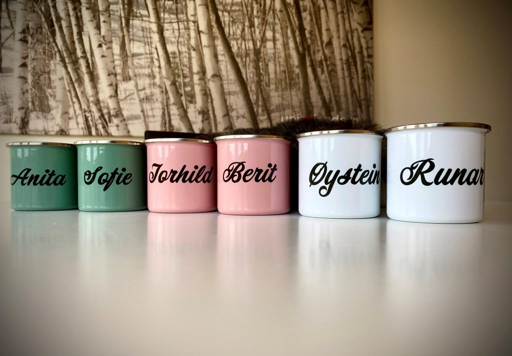 Stort utvalg av kopper og flasker i ulike former og materialer – emalje, porselen, farget, karabinkopp m.m.