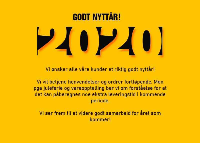 Vi ønsker alle våre kunder et Riktig Godt Nyttår! Vi vil betjene henvendelser og ordrer fortløpende. Men pga juleferie og vareopptelling ber vi om forståelse for at det kan påberegnes noe ekstra leveringstid i kommende periode.