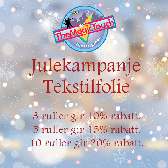 Nå med 4 farger selvklebende vinylfolie (10m av sort/hvit/blå/rød) og Medium Tack (verdi Kr 6010,-) I tilegg til de 5 rullene med tekstilfolie. Vi har folien på lager