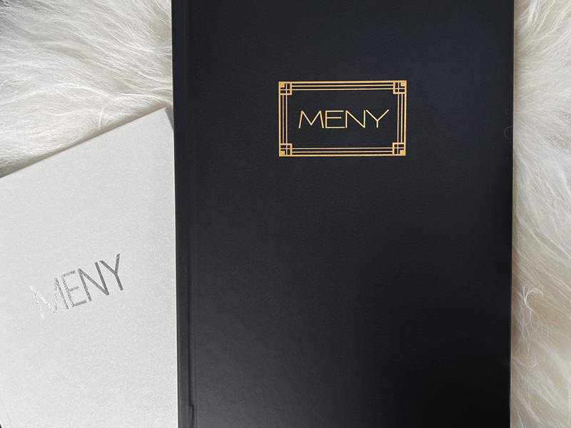 Bestill personlige elegante menyer med deres logo trykket på bokens forside. Størrelsen på logo trykket bestemmer dere. Menyene leveres inkludert dokumentskinne i ryggen. Med en dokumentskinne kan dere enkelt endre meny innholdet selv. Vi trykker logo på menyens forside. Trykket leveres i eksklusiv gull eller sølvtrykk. Utførelsen på bokomslaget er standard sort eller delikat perlehvit. Bokcoveret kan tørkes av med en fuktig klut. Hva er ikke hyggeligere enn å få en personlige smakfull og presentabel meny beskrevet i en innbydende bok. Menyen ivaretar 2-20 ark for innhold. Arkene er enkel å ta ut og legges inn. Dere benytter deres printer for produksjon og print av meny innholdet.