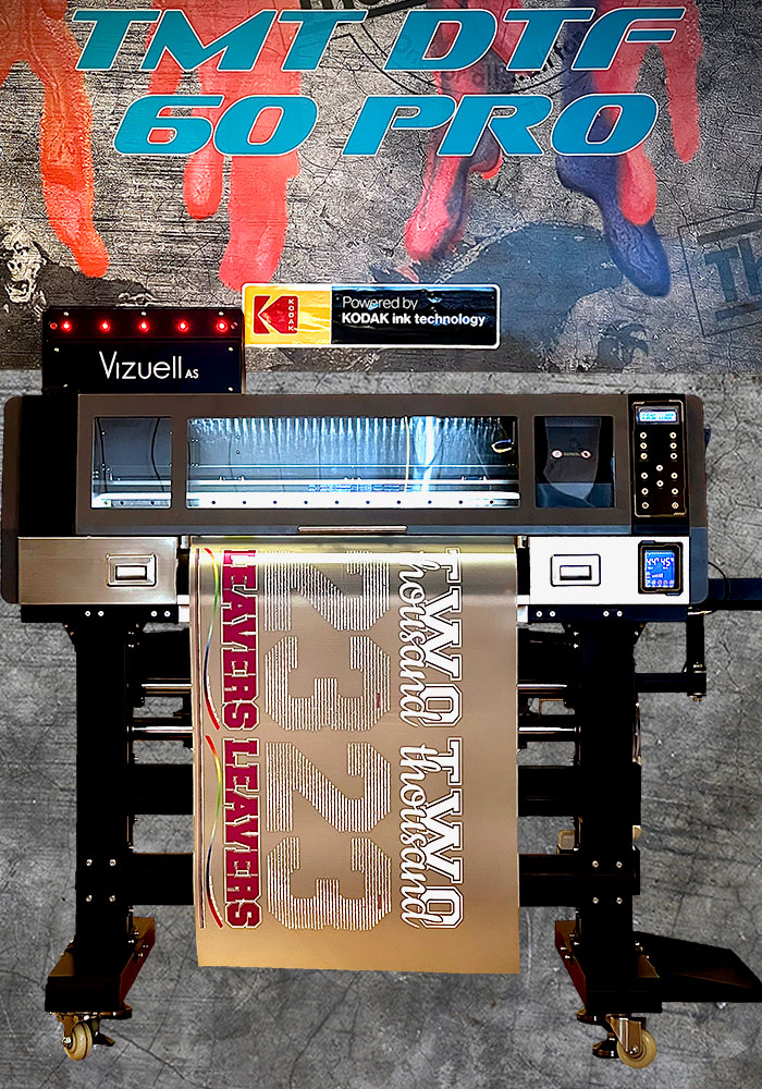 Med en TMT DTF 60 PRO printer produserer dere fullfarge transfermerker direkte på en film (DTF – Direct to Film). TMT DTF 60 PRO printer benytter høykvalitetsblekk fra Kodak®. TMT DTF 60 PRO produserer transfermerkene på rull (B60cm) med en hastighet på 15 kvadratmeter i timen. Maskinen har det laveste arealkrav i forhold til produksjons format på bredde 60cm. Dette er en profesjonell maskin for effektiv produksjon at transfermerker. Først printes logoene på foliefilmen for deretter påføres lim-pulver. Hele prosessen er delikat, rask og enkel.