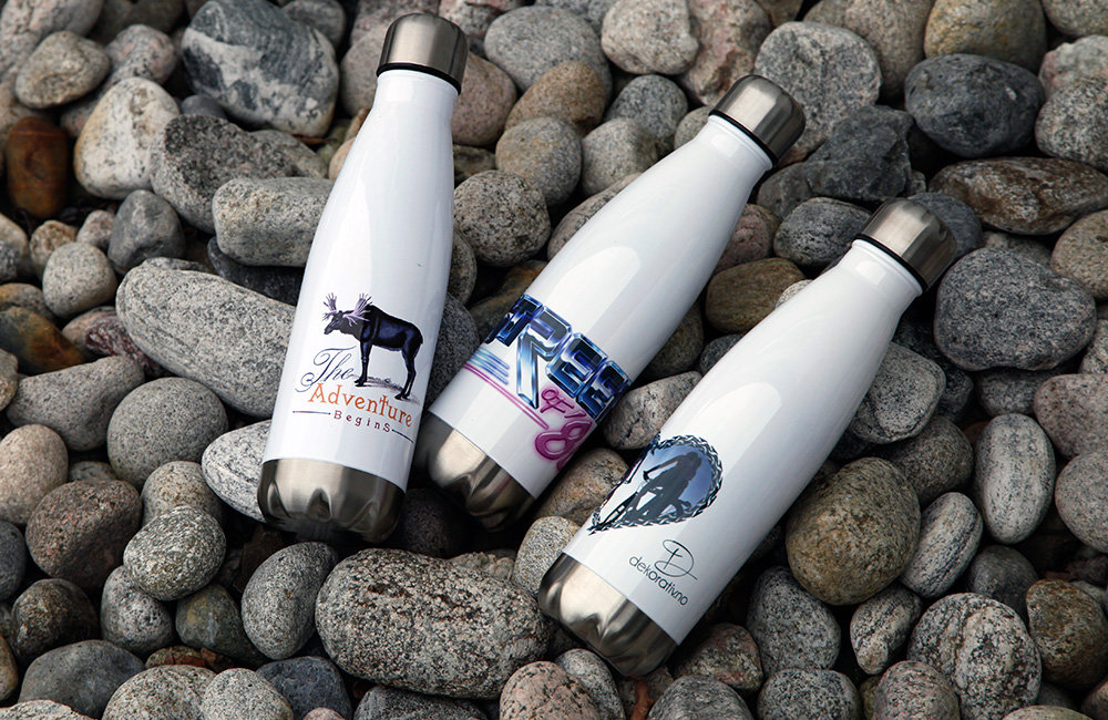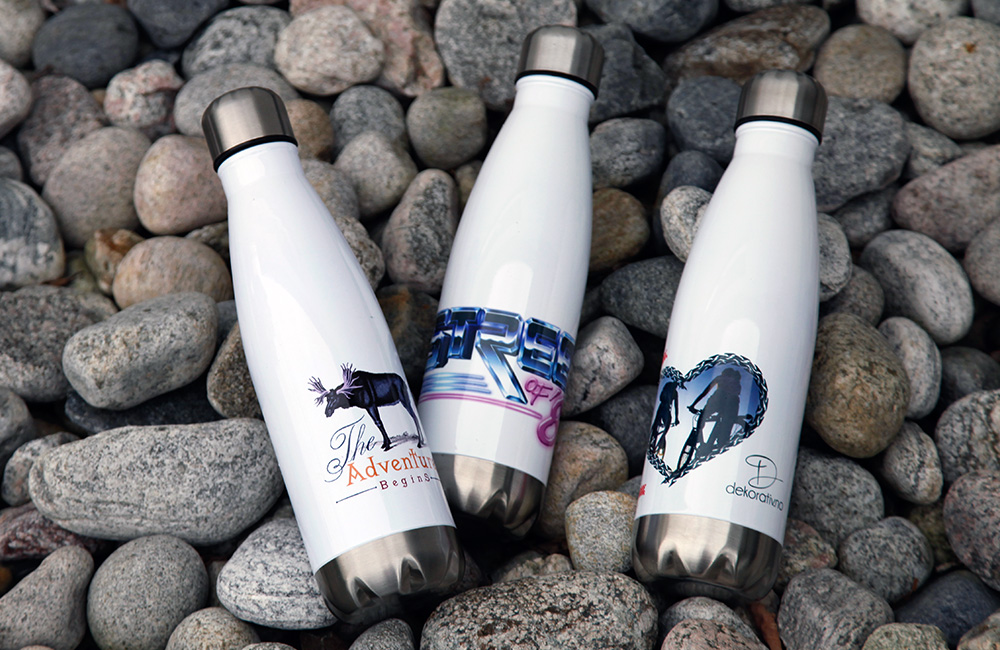 Vi leverer nå praktiske og stilrene drikkeflasker med polyesterbelegg, perfekt egnet til sublimeringstrykk.Flaskene er hvite, slik tillater man fullfarge trykk i alle regnbuens farger.