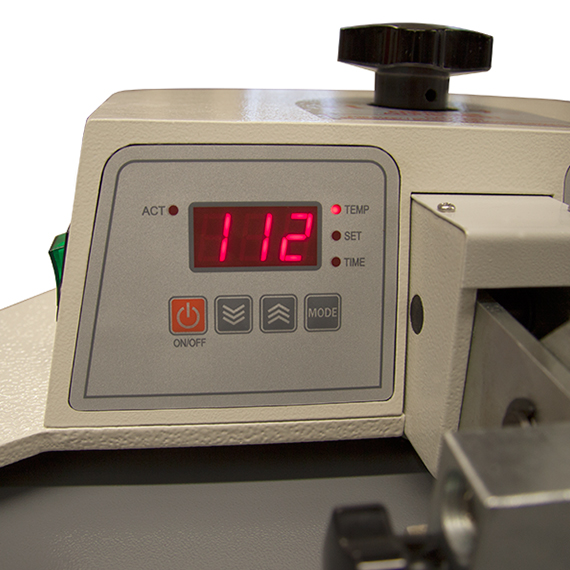 En høy kvalitets varmepresse med støpt aluminiumsramme produsert i England. Varmepressen har en sving bar topp plate som gir deg god sikt og enkel tilgang til det du skal trykke på. Utstyrt med avansert datastyrt LED-kontroller for nøyaktig innstilling av både tid og temperatur. Trykkjustering er lett tilgjengelig oppe på varmepressen.